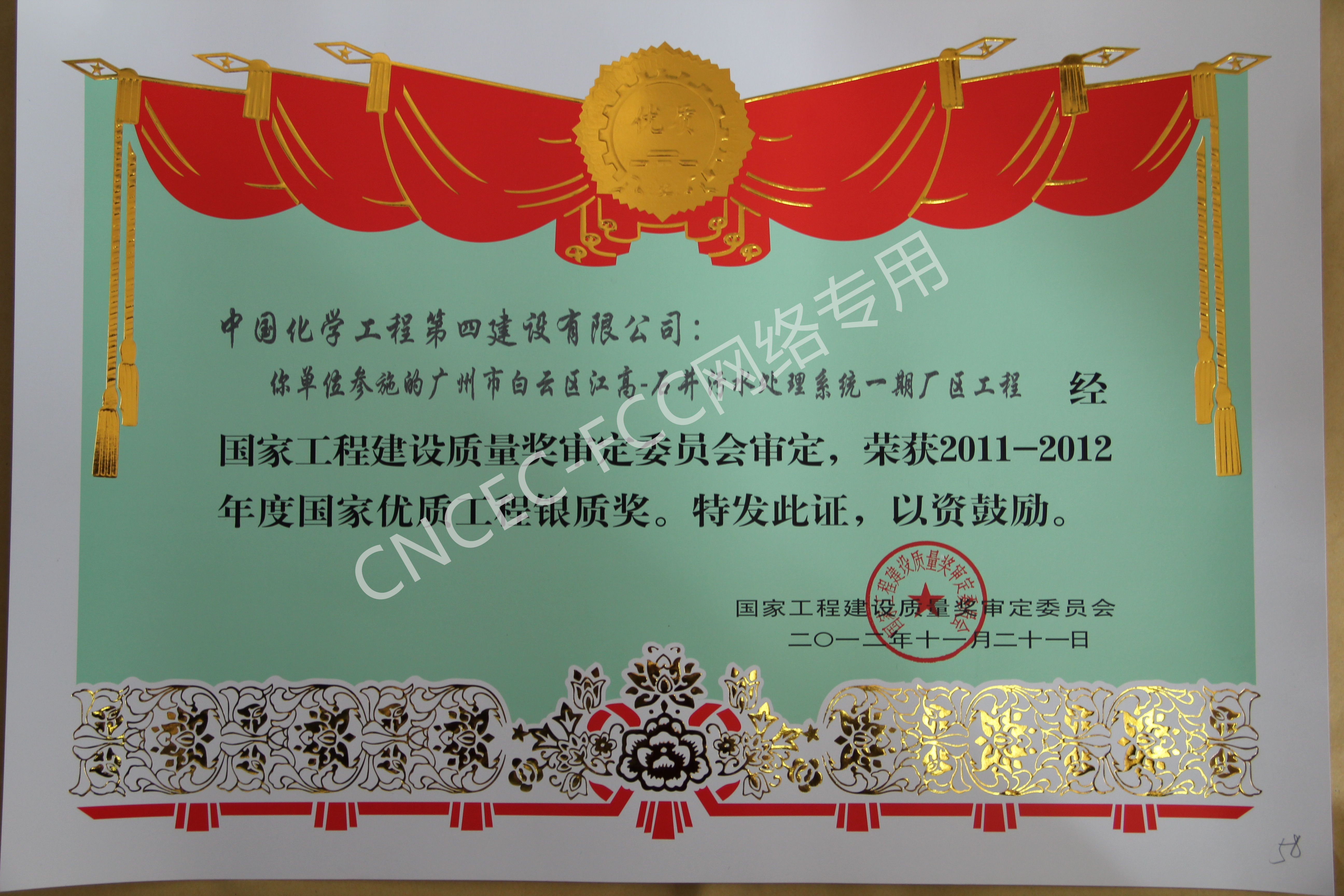 廣州市白云區(qū)江高-石井污水處理系統(tǒng)一期廠區(qū)工程國家優(yōu)質(zhì)工程銀質(zhì)獎
