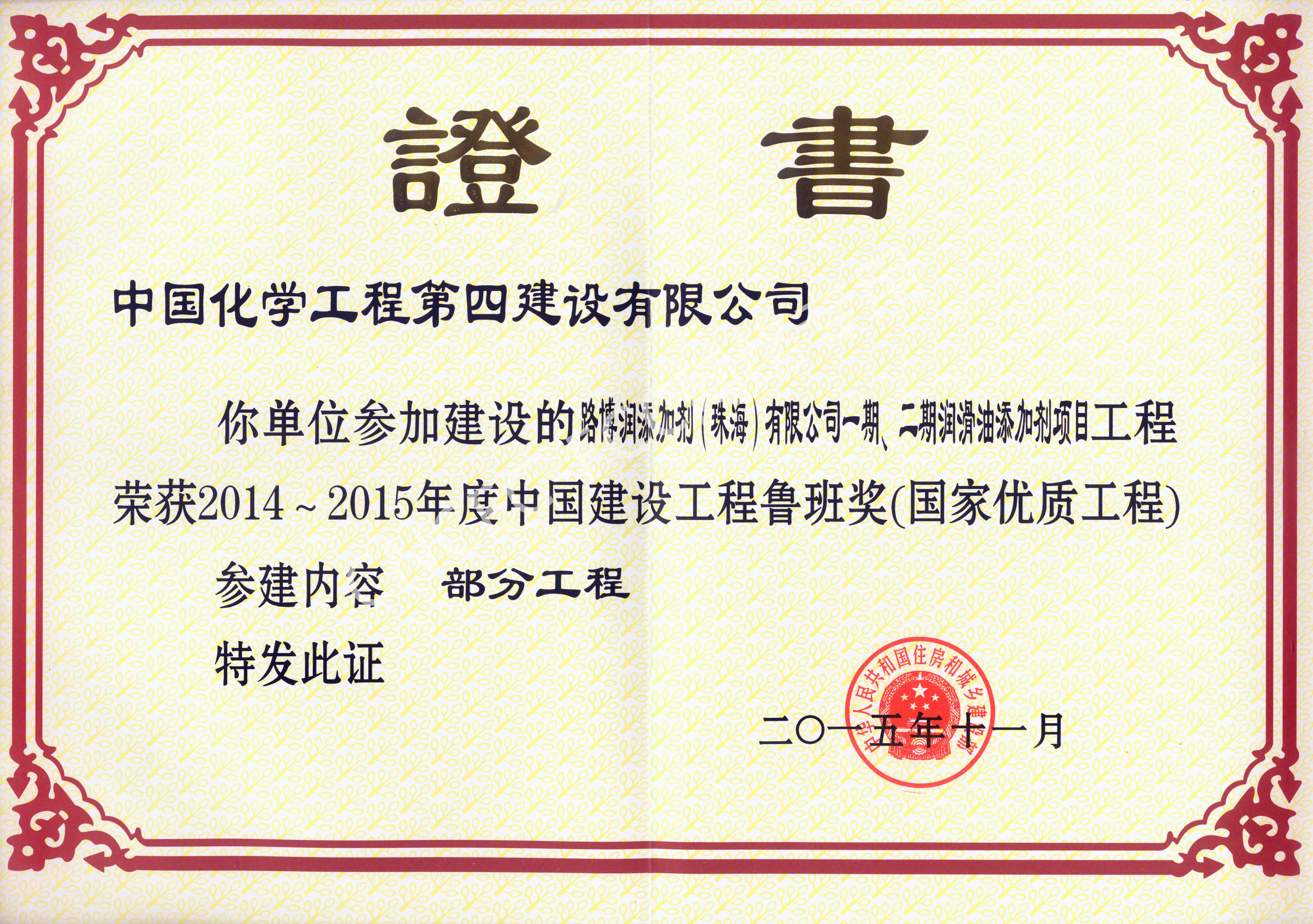 路博潤添加劑(珠海)有限公司一期、二期潤滑油添加劑項(xiàng)目中國建設(shè)工程魯班獎(jiǎng)