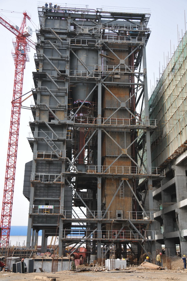 由一處平頂山項(xiàng)目部承建的平煤集團(tuán)聯(lián)合鹽化有限責(zé)任公司120萬噸/年配套2×130t/h循環(huán)流化床鍋爐供熱安裝工程,經(jīng)過100多天的日夜奮戰(zhàn),于5月1日水壓試驗(yàn)一次成功。該工程為平煤集團(tuán)聯(lián)合鹽化有限責(zé)任公司重點(diǎn)項(xiàng)目。130T/H硫化床鍋爐為室外布置,由前部及尾部兩個(gè)豎井煙道組成。前部豎井為懸吊結(jié)構(gòu),四壁由膜式水冷壁組成,自下而上依次為硫化床、風(fēng)室、水平通道。尾部豎中采用支承結(jié)構(gòu),自上而下布置有高溫過熱器、低溫過熱器、省煤器及空氣預(yù)熱器。兩豎井之間由水冷式旋風(fēng)分離器相連通,分離器下部接回送裝置返料器。燃燒室及分離器內(nèi)部均設(shè)有防磨內(nèi)襯,前部豎井采用敷管爐墻,外置金屬護(hù)板,由吊掛裝置承受鍋爐全部重量。鍋爐運(yùn)轉(zhuǎn)層在8米層,主蒸汽管道為φ273,施工難度非常高。