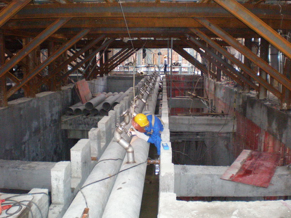 針對作業(yè)面在地下負二層,光線較差、通風不暢,同時土建單位正在拆除臨時支撐,施工現(xiàn)場工作環(huán)境相當惡劣等情況。為保證現(xiàn)場施工正常有序的進行和施工人員身體健康,項目部采取相應措施保證了整個現(xiàn)場的安全、照明、通風。施工人員發(fā)揚四化建吃苦耐勞、敢打敢拼的精神,長期冒雨作業(yè)。吊裝中有吊機運行不到的地方,就積極開動腦筋,用技巧、經(jīng)驗和人力,保證前期設備及管道的吊裝倒運,為后期的施工做好了良好的鋪墊。