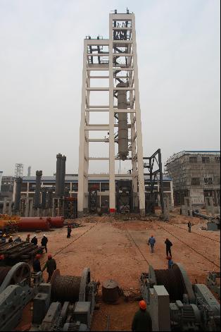 由一處承建的金象18·30合成裝置區(qū)合成氨裝置/醇烷化及氨合成工序需就位靜設(shè)備31臺,就位體積最大、重量最重、吊裝難度最大的要算氨合成塔這個龐然大物了,氨合成塔自重390噸,高25米,是山西金象煤化工有限責(zé)任公司18萬噸合成氨/30萬噸尿素工程(簡稱18·30工程)兩大主體形象工程之一。