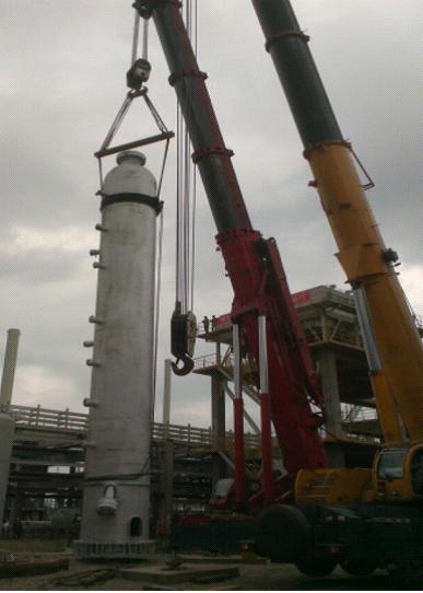 這樣的笑容來之不易。3臺反應(yīng)器,最高的有19米多,單臺重量最大達(dá)到141余噸??偘鼏挝辉谠O(shè)計的時候未考慮吊耳。由于材質(zhì)特殊,也無法在設(shè)備上施焊增加吊耳,這是最棘手的??偘鼏挝皇譄o策,但又不同意項目部提出采用鋼絲繩捆綁式的吊裝方案,猶豫著不愿意簽字,萬一有個失誤,后果不堪設(shè)想!為了這次吊裝,江蘇分公司給予了大力支持,派出了經(jīng)驗豐富的起重吊裝專業(yè)工程師,多次到現(xiàn)場、到基地與總包單位反復(fù)論證方案的可行性。激烈的討論、嚴(yán)謹(jǐn)?shù)挠嬎?、類似業(yè)績的展示……一次又一次的努力,項目部滿滿的信心和十足的把握最終讓總包單位同意了這個方案。