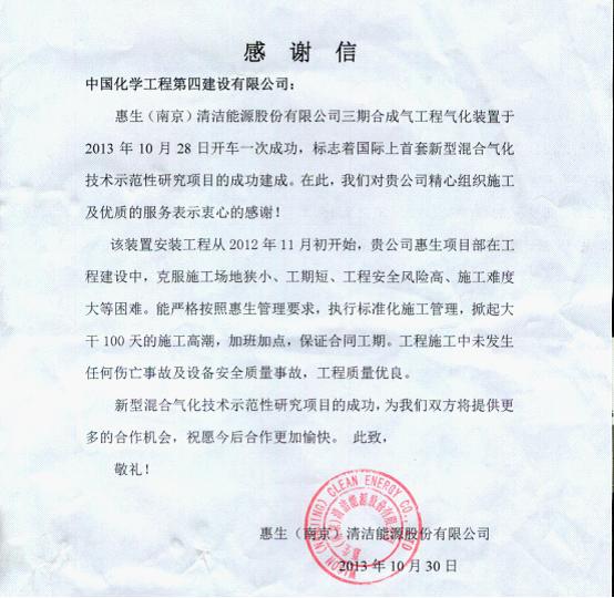 氣化裝置是繼其他各套系統(tǒng)開車成功后最后開車的核心裝置。它的成功開車標(biāo)志著全部施工任務(wù)圓滿完成。分公司在該項(xiàng)目上創(chuàng)造了工程進(jìn)度、質(zhì)量安全、業(yè)主服務(wù)三個一流,用心血和汗水為業(yè)主奉獻(xiàn)了精品工程,展示了化建湘軍的風(fēng)采,更獲得了業(yè)主來信高度贊揚(yáng)!