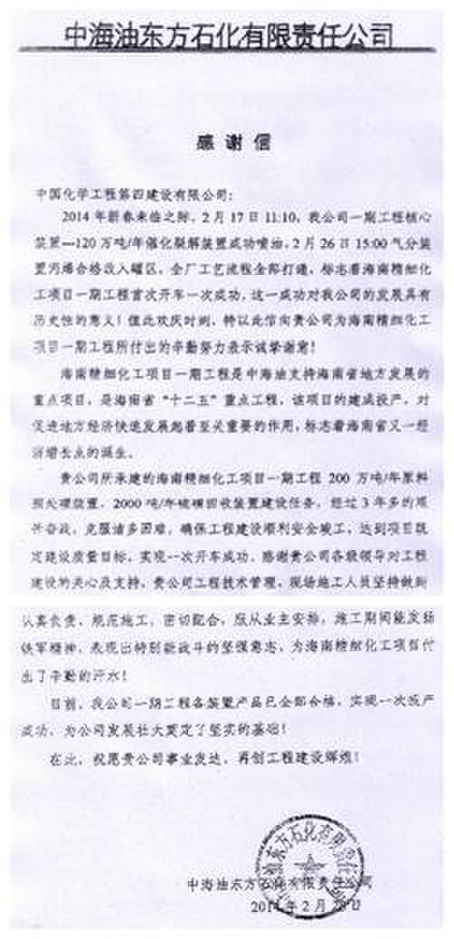 自2010年8月11日開工以來,項目部在分公司經(jīng)理陳文彬、項目經(jīng)理劉興陽的領(lǐng)導下,艱苦奮戰(zhàn)、精心組織、精細管理,工程整體形象良好、工程建設(shè)程序規(guī)范、質(zhì)量控制到位,于2013年9月28日按期順利實現(xiàn)機械竣工。通過投料試車,該項目達到一次試車成功、生產(chǎn)出合格產(chǎn)品的良好效果,受到了中海油東方石化有限責任公司的來信稱贊。