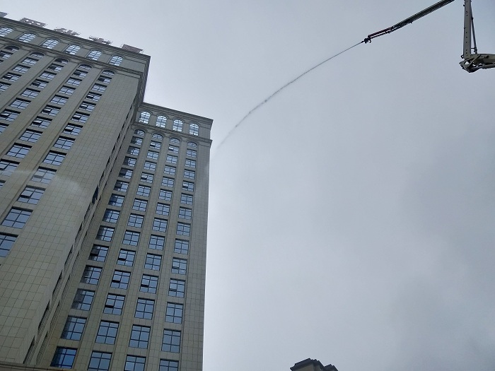 6月22日上午9時30分,四化大廈9樓濃煙滾滾,樓內(nèi)警鈴大作,員工們手拿濕毛巾,捂住口鼻從樓內(nèi)消防通道快速有序的撒離疏散到安全地帶,工作人員不時提醒疏散人員清點人數(shù),報告?zhèn)銮闆r和穩(wěn)定情緒。不到兩分鐘時間,兩臺消防車風(fēng)馳電掣的駛?cè)氪髲B院內(nèi),全副武裝的消防隊員快速啟動消防裝備,分兩路進(jìn)行救援和滅火。不一會兒,樓內(nèi)滅火隊員和消防云梯車幾乎同時噴出水柱直達(dá)20樓頂。