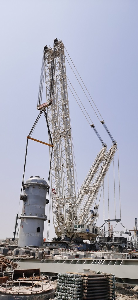 該EO反應(yīng)器為乙二醇裝置單體最重設(shè)備,設(shè)備凈重1128噸。江蘇分公司浙石化二期乙二醇裝置項目部施工人員采用由3200噸履帶吊主吊、280噸履帶吊溜尾進(jìn)行吊裝。經(jīng)過約2個多小時的起吊、平衡、轉(zhuǎn)體,上午11點16分順利就位,設(shè)備一次吊裝成功。