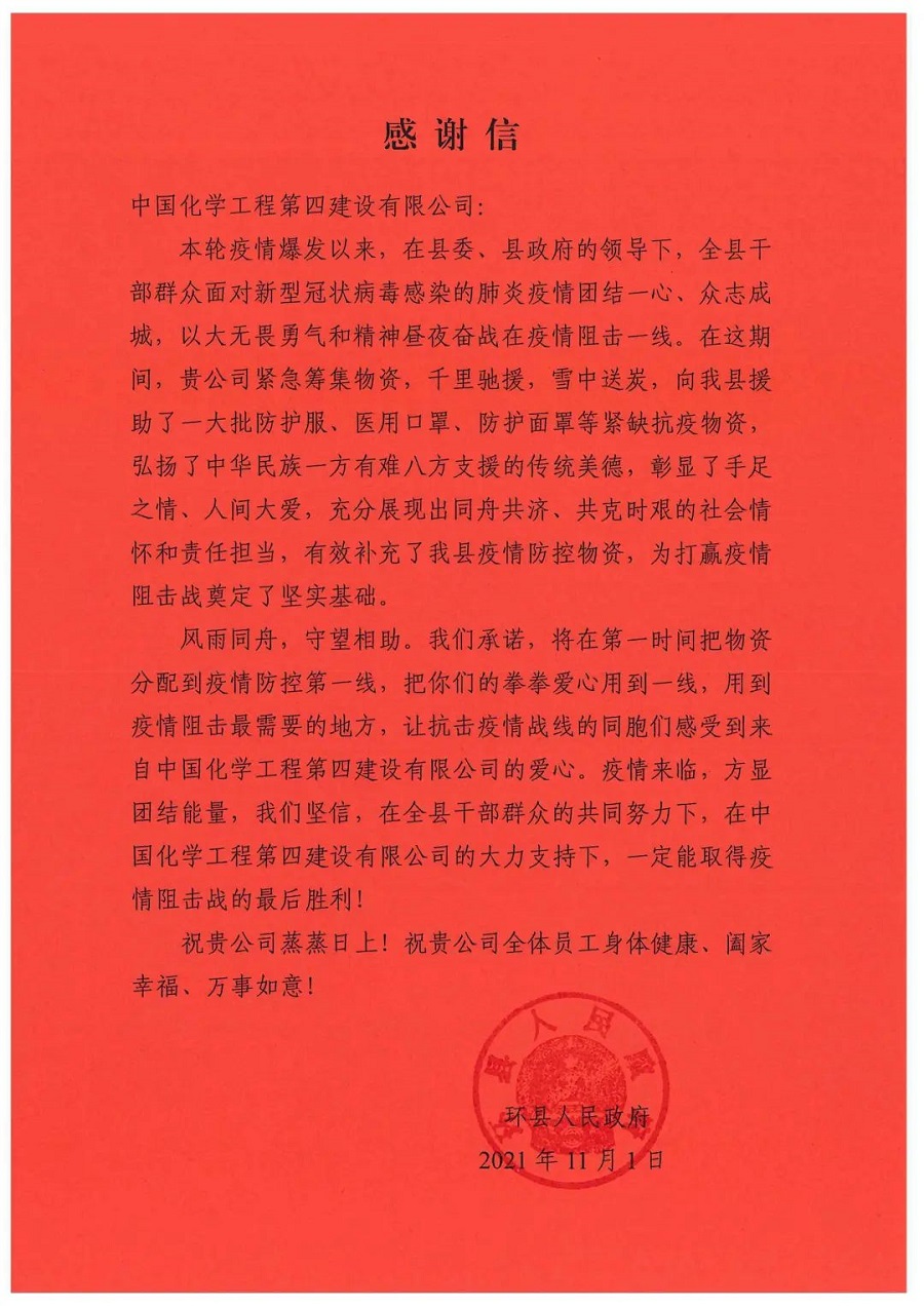 11月1日,公司收到甘肅省環(huán)縣人民政府向公司發(fā)來的感謝信。信中對公司向環(huán)縣進行抗疫物資捐贈的愛心舉動表示衷心感謝,并稱在這個特殊時期,公司主動參與環(huán)縣的疫情防控,用拳拳愛心凝聚正能量,以殷殷真情共筑防控網(wǎng),既體現(xiàn)了大國央企的責任擔當,更加深了中國化學與環(huán)縣的手足之誼。