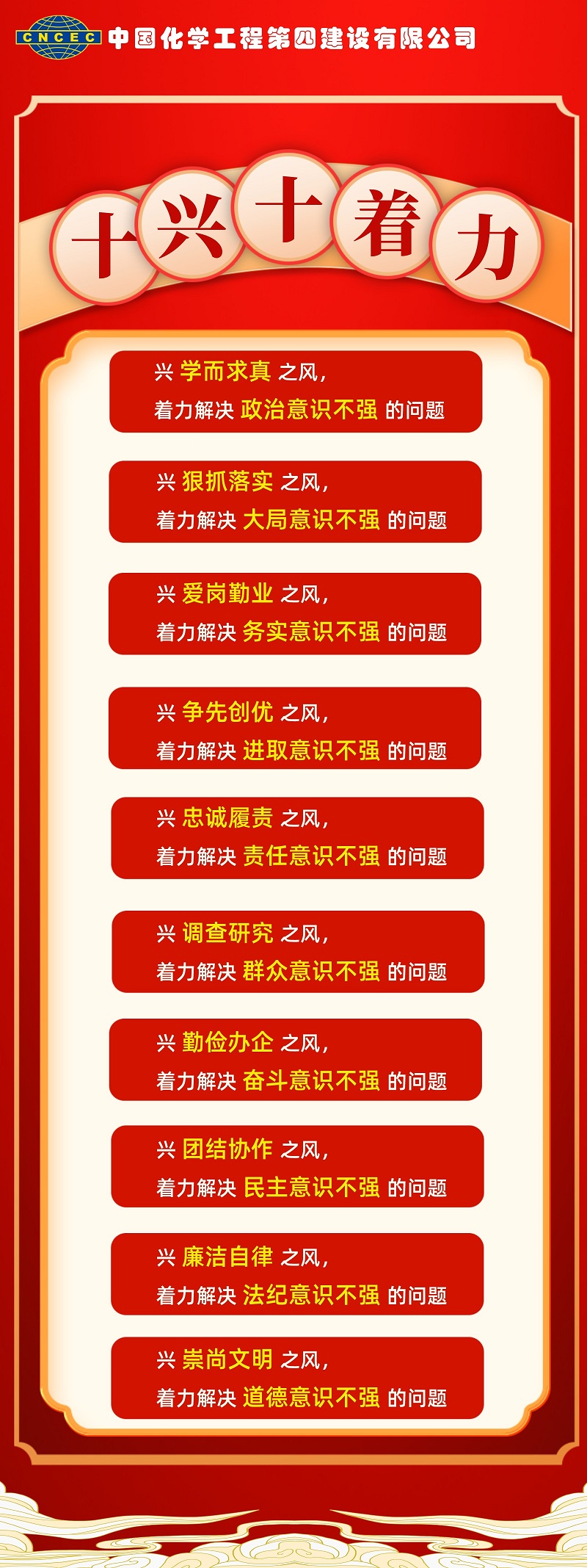 活動通知中針對公司職工在工作中存在的思想、責任、作風三個“不在線”問題,明確了作風建設重點治理的總體目標,以支部為單位,組織開展“能力作風建設”大討論,努力實現(xiàn)“十興十著力”目標。從今天起,公司將對“十興十著力”目標進行深入解讀。