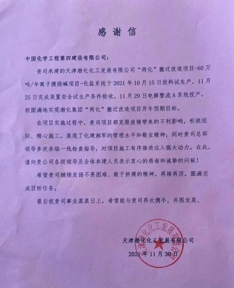 2021年11月29日,天津渤化“兩化搬遷”60萬噸離子膜燒堿項目電解整流A系一次送電成功,相繼產(chǎn)出燒堿、鹽酸等合格產(chǎn)品,進入試生產(chǎn)階段。