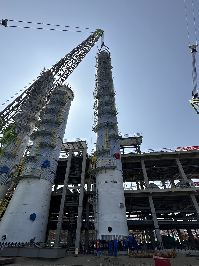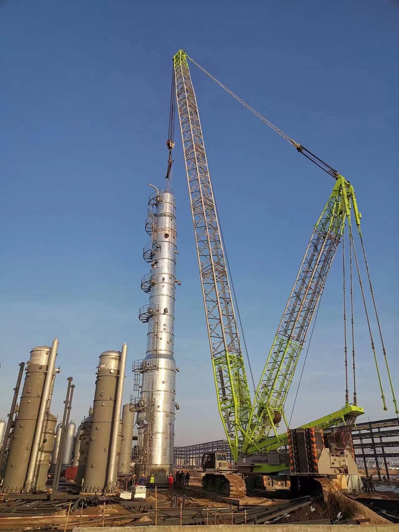 該甲醛吸收塔直徑 4.4米、高74米、重118噸,是該項目現(xiàn)場最大、最重設(shè)備。在吊裝中,項目施工人員采用抬運法,即以265噸履帶吊為主吊,180噸履帶吊輔助,兩輛吊車相互配合、緊密協(xié)作,順利完成甲醛吸收塔吊裝。