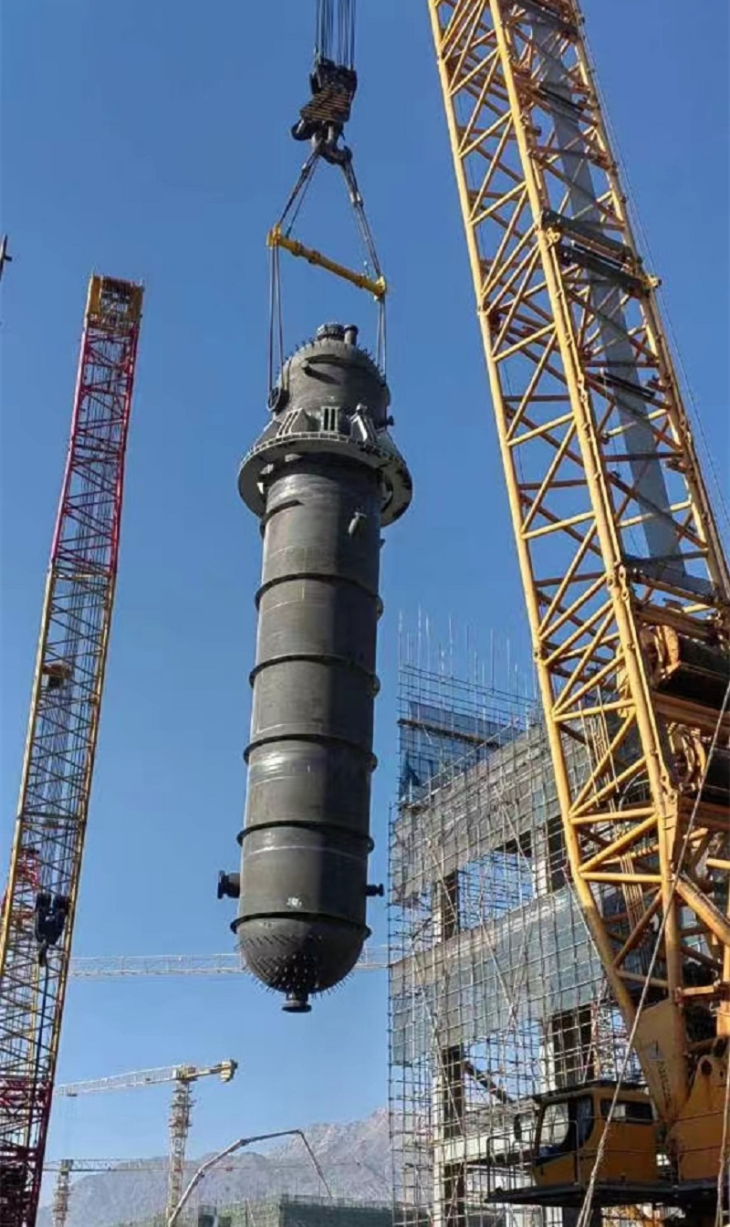 該反應(yīng)器直徑4米、高27.4米、重287噸。為確保安全順利完成此次吊裝,項目部精心編制、優(yōu)化吊裝方案,在吊裝中采用“雙機抬吊遞送法”,即以1600噸履帶吊主吊和450噸履帶吊溜尾,一次性完成冷氫化反應(yīng)器吊裝。
