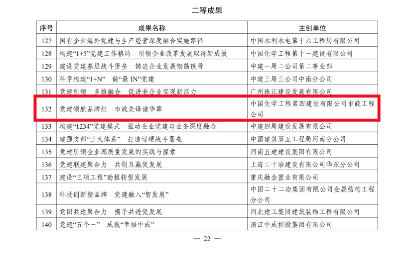 5月27日,從中國施工企業(yè)管理協(xié)會傳來喜訊,公司選送的黨建案例《黨建引領(lǐng)價值創(chuàng)造 繪就“雙百億”發(fā)展新畫卷》獲評2024年工程建設企業(yè)黨建工作一等成果,市政工程公司選送的黨建案例《黨建領(lǐng)航品牌紅 市政先鋒譜華章》和華南公司選送的黨建案例《黨建引領(lǐng)“粵向前” 融合發(fā)展譜新篇》獲評二等成果。