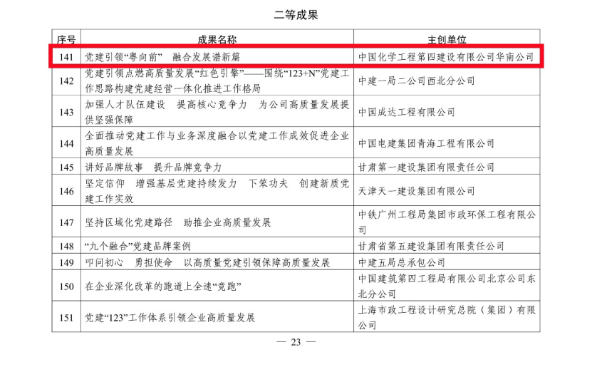 2023年以來,公司黨委先后榮獲“工程建設行業(yè)黨建工作示范單位”“中國石油和化學工業(yè)文化建設先進單位”等榮譽,公司黨委黨建品牌“黨旗領(lǐng)航·四化先鋒”榮獲中施企協(xié)2023年“工程建設企業(yè)黨建工作最佳案例”等稱號。下一步,公司將以此為契機,持續(xù)總結(jié)推廣企業(yè)黨的建設的先進經(jīng)驗,厚植高質(zhì)量黨建引領(lǐng)保障高質(zhì)量發(fā)展優(yōu)勢,為做強做優(yōu)做大國有資本提供堅強的政治保證和組織保證。