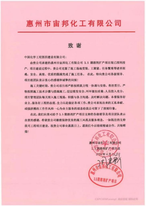 近日,公司收到惠州市宙邦化工有限公司發(fā)來(lái)的致謝信,信中對(duì)公司圓滿(mǎn)完成惠州市宙邦化工有限公司3.5期溶劑擴(kuò)產(chǎn)項(xiàng)目施工任務(wù)表示衷心感謝。