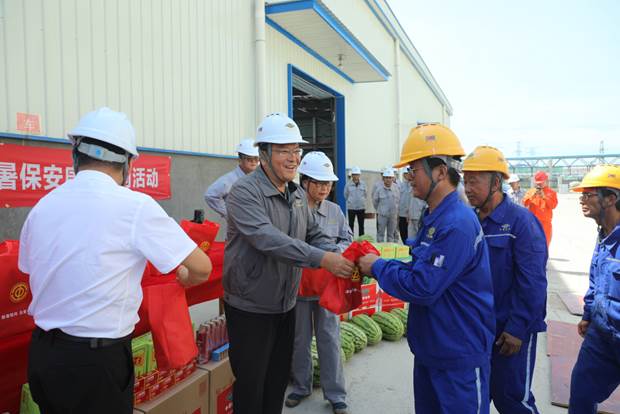 在項(xiàng)目現(xiàn)場(chǎng),趙亮為一線建設(shè)者們送上了西瓜、涼茶、防曬物品等“清涼大禮包”,對(duì)他們的辛勤付出表示感謝,高度贊揚(yáng)他們不畏高溫、愛崗敬業(yè),為項(xiàng)目建設(shè)作出了積極貢獻(xiàn),并囑咐他們?cè)诟邷靥鞖庀伦鳂I(yè)要加強(qiáng)防護(hù),做好防暑降溫工作,保障自身健康安全。同時(shí),他強(qiáng)調(diào),岳化新材料項(xiàng)目部要妥善安排好一線職工的生產(chǎn)生活,切實(shí)關(guān)心職工身體健康,確保職工在室內(nèi)、室外的工作環(huán)境安全。