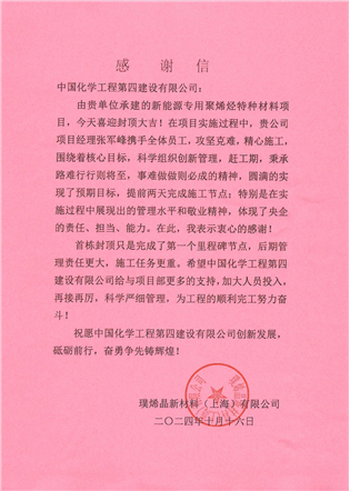 近日,璞烯晶新材料(上海)有限公司向華東公司發(fā)來感謝信,對(duì)項(xiàng)目團(tuán)隊(duì)在璞烯晶新能源專用聚烯烴特種材料項(xiàng)目節(jié)點(diǎn)攻堅(jiān)的突出表現(xiàn)予以高度贊揚(yáng)和衷心感謝。