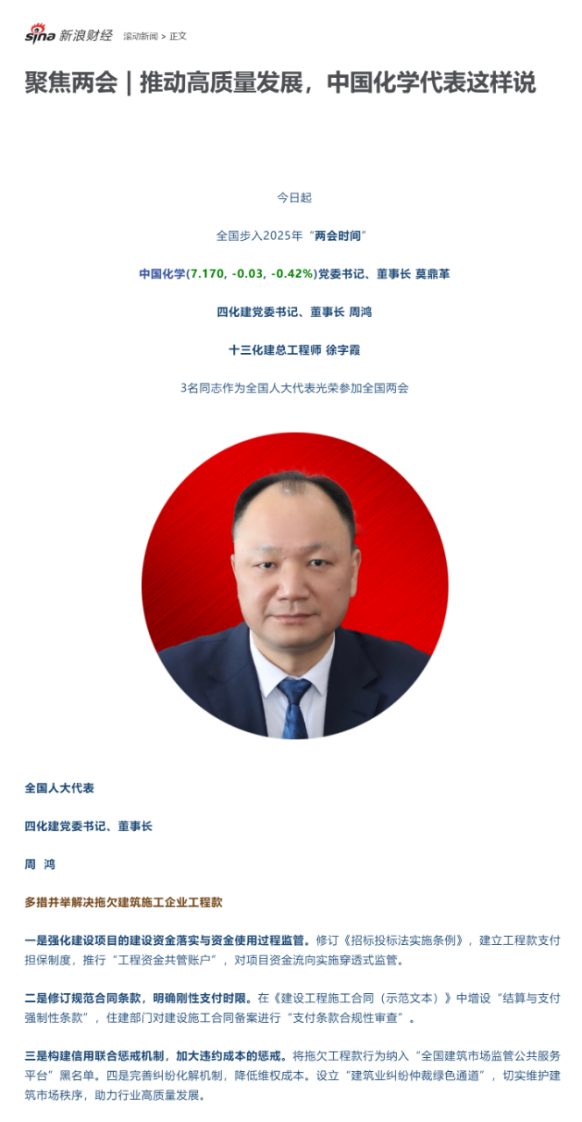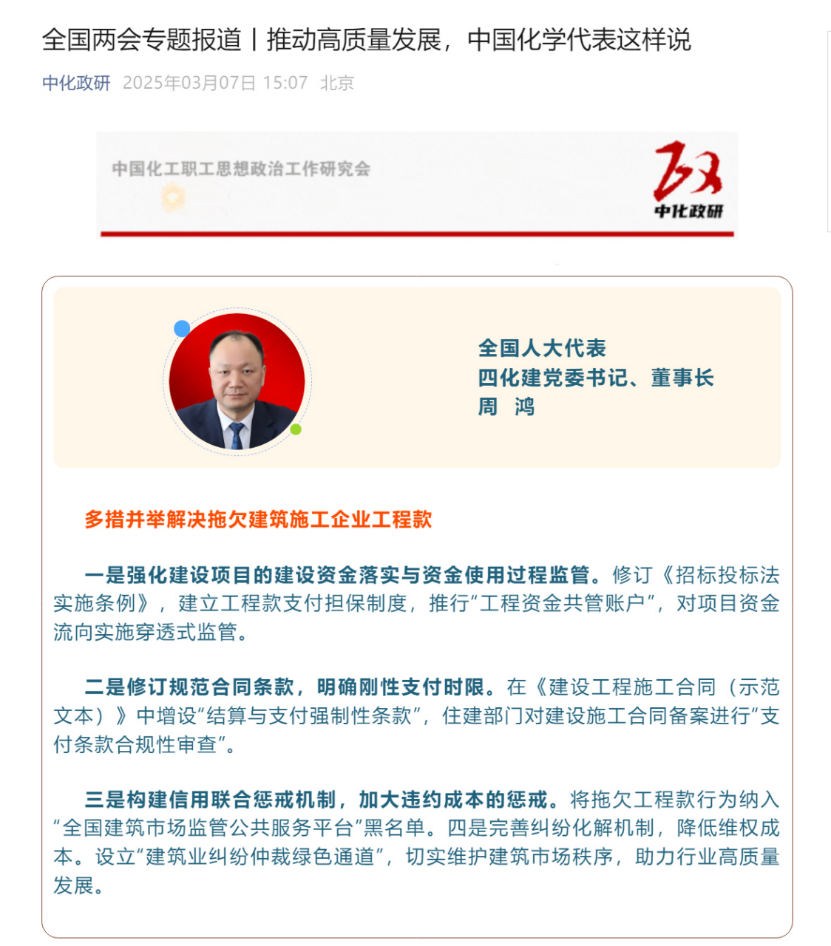 2025年全國兩會期間,全國人大代表,中國化學四化建黨委書記、董事長周鴻向大會提交《關于加強產(chǎn)業(yè)工人隊伍建設的建議》《關于多措并舉解決拖欠建筑施工企業(yè)工程款的建議》《關于推動洞庭湖區(qū)常岳九鐵路、荊岳鐵路、監(jiān)利至華容至益陽鐵路規(guī)劃建設提速的建議》《關于修改最高法院〈關于大型企業(yè)與中小企業(yè)約定以第三方支付款項為付款前提條款效力問題的批復〉的建議》等4條建議,受到主流媒體深入報道,引起社會各界廣泛關注。