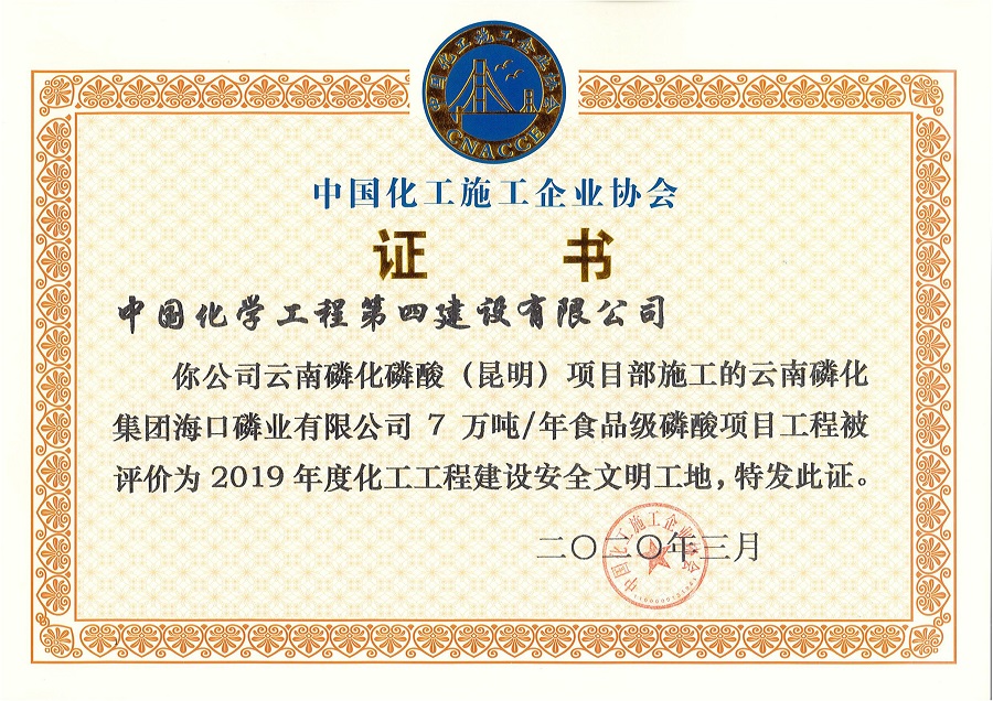 5月21日,西南分公司收到中國化工施工企業(yè)協(xié)會頒發(fā)的云南磷化??诹讟I(yè)有限公司7萬噸/年食品級磷酸項目“2019年度化工工程建設(shè)安全文明工地”證書。