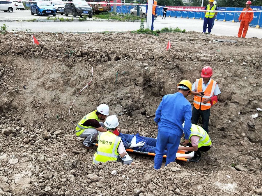 演練開始,現(xiàn)場(chǎng)人員向總指揮報(bào)告事故發(fā)生及人員被埋情況,并迅速安排各個(gè)救援小組分別進(jìn)行救援。根據(jù)應(yīng)急預(yù)案,各應(yīng)急救援組成員收到救援命令后,立即投入到搶險(xiǎn)救援工作中去。安保組安排人員封鎖道路,設(shè)專人指揮交通,保障現(xiàn)場(chǎng)救援通道暢通;技術(shù)保障組及時(shí)勘察事故實(shí)際情況,避免發(fā)生二次坍塌事故;物資保障組及時(shí)提供搶險(xiǎn)救援物資;醫(yī)療組緊跟搶險(xiǎn)組趕赴現(xiàn)場(chǎng),迅速展開救援活動(dòng),將“獲救”人員用擔(dān)架抬至空曠地帶,進(jìn)行初步包扎和搶救直至救護(hù)車到達(dá)。
