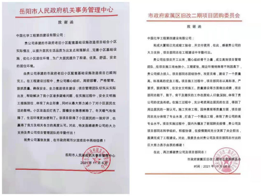 近日,建筑工程分公司和成大廈項(xiàng)目、岳陽(yáng)市政府家屬區(qū)改造項(xiàng)目分別收到岳陽(yáng)市政府家屬區(qū)舊改二期項(xiàng)目團(tuán)購(gòu)委員會(huì)、岳陽(yáng)市人民政府機(jī)關(guān)事務(wù)管理中心送來的兩封致謝函。
