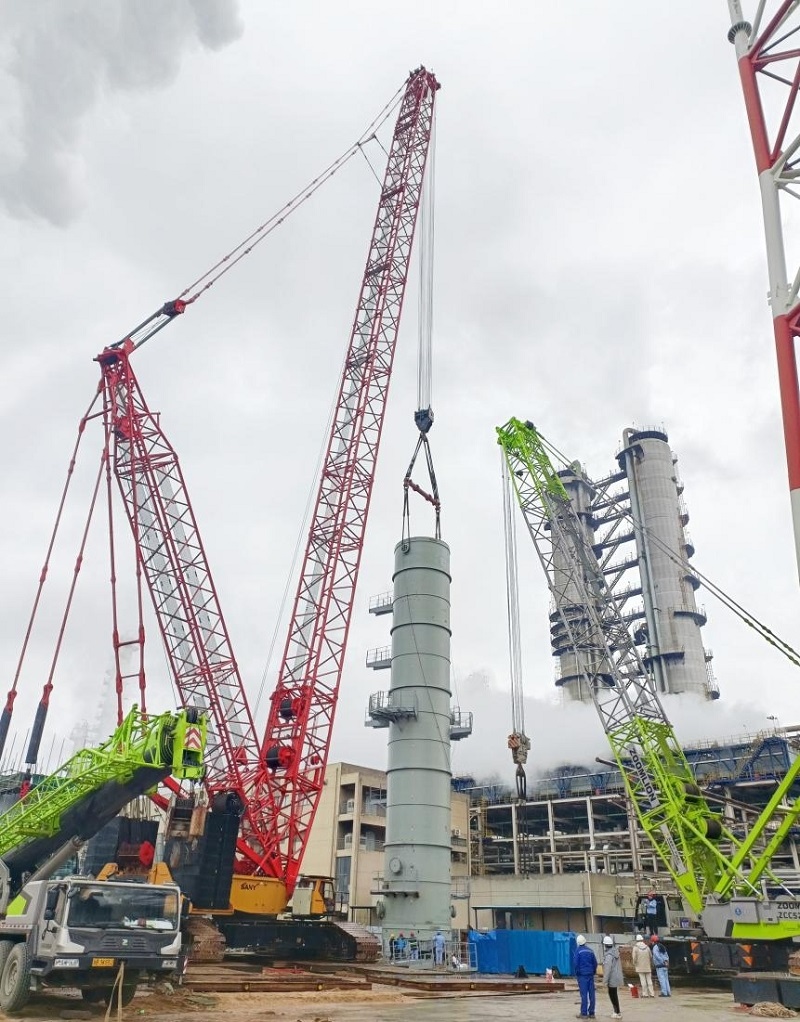 該設(shè)備重量為120.6噸、筒體直徑4.6米、高28.29米,是項目的核心設(shè)備,屬大型吊裝作業(yè)。為確保安全順利完成吊裝,項目部編制了專項施工方案和措施,對現(xiàn)場全體施工人員進(jìn)行了安全技術(shù)交底。在吊裝過程中,項目施工一線人員嚴(yán)格按照方案施工,努力克服吊裝工作場地狹小、工序多、技術(shù)要求高的不利影響,緊密協(xié)作、共同努力,整個吊裝過程有條不紊,實現(xiàn)了一次吊裝成功。