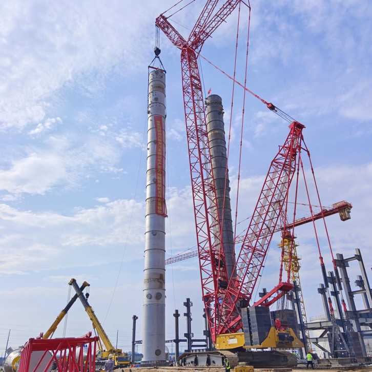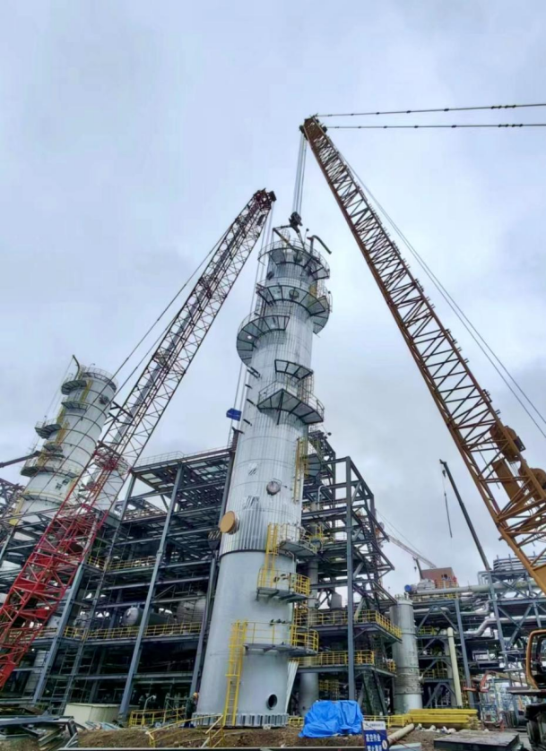 為響應(yīng)公司“奮戰(zhàn)四季度、決勝雙百億”號(hào)召,中秋國(guó)慶雙節(jié)期間,項(xiàng)目部全體人員堅(jiān)守施工一線,確保項(xiàng)目吊裝等各項(xiàng)工作穩(wěn)步推進(jìn)。此次吊裝的輕組分塔規(guī)格為Φ3636×59100、設(shè)備自重123噸,重組分塔規(guī)格為Φ3940×65800、設(shè)備自重175噸,是項(xiàng)目主裝置的關(guān)鍵設(shè)備。