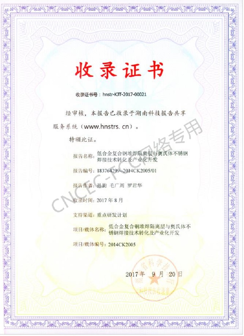 科技成果報告收錄證書:低合金復合鋼堆焊隔離層與奧氏體不銹鋼焊接技術轉(zhuǎn)化及產(chǎn)業(yè)化開發(fā)
